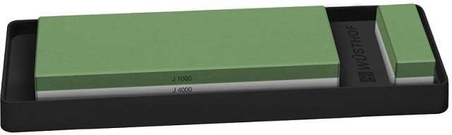 Pierre à aiguiser de haute qualité pour aiguisage à l'eau Wüsthof avec support antidérapant et petite pierre de redressage. Avec un grain ultra fin J1000/4000. Les couteaux conservent leur tranchant même après une utilisation prolongée. Les particules créées lors de l'aiguisage se rassemblent dans le support, gardant ainsi le plan de travail propre.