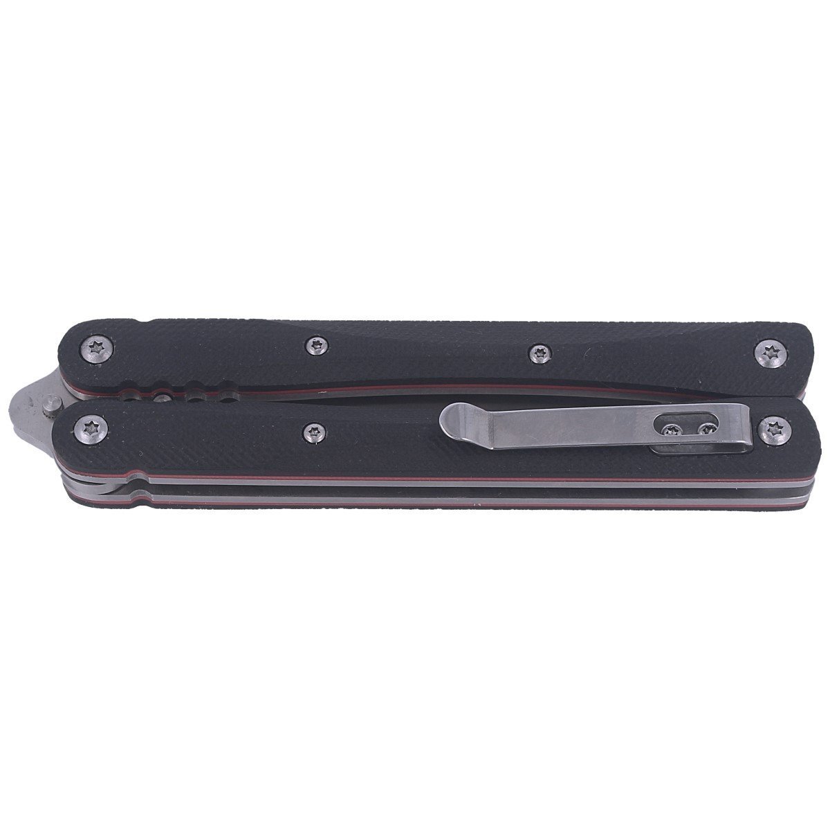 La lame est fabriquée en acier inoxydable 440C. Un travail de précision et des roulements de haute qualité garantissent que le tranchant ne touche pas l'intérieur du manche. Le manche, caractéristique de tous les balisongs, est fabriqué en acier inoxydable et en matériau G-10, permettant une prise ferme. Un détail intéressant est les inserts rouges. Le couteau n'a pas de verrouillage classique comme la plupart des balisongs; le fabricant a résolu cela en intégrant de puissants aimants dans le manche. Le couteau est équipé d'un clip pour le port en poche.
