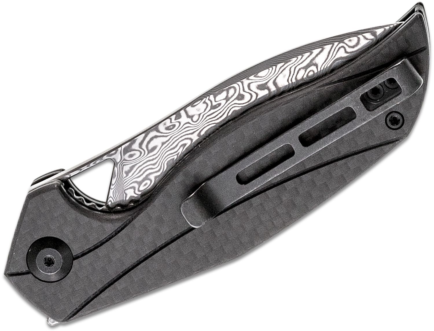 Anthropos est un modèle conçu par le designer Elijah Isham. Malgré son manche de petite taille, le couteau tient bien en main. La lame est fabriquée en acier damas chinois D2 (59-61HRC), avec une finition Satin Finish. Elle possède une pointe acérée et un ventre, ce qui est particulièrement apprécié lors de la coupe. Elle s'ouvre grâce à une ouverture triangulaire sur la lame ou un petit Flipper. Une fois ouvert, le couteau est solidement sécurisé par un mécanisme Liner Lock. Le manche est renforcé par des inserts en acier encastrés et une incrustation en plastique noir entre les plaquettes. Celles-ci sont fabriquées en matériau G10 noir dans lequel sont intégrées des fibres de carbone. Le clip est en acier, de couleur noire et à double position, ce qui signifie que vous pouvez le déplacer selon vos besoins. Il est idéal pour un port profond. Le couteau est adapté à une utilisation quotidienne.