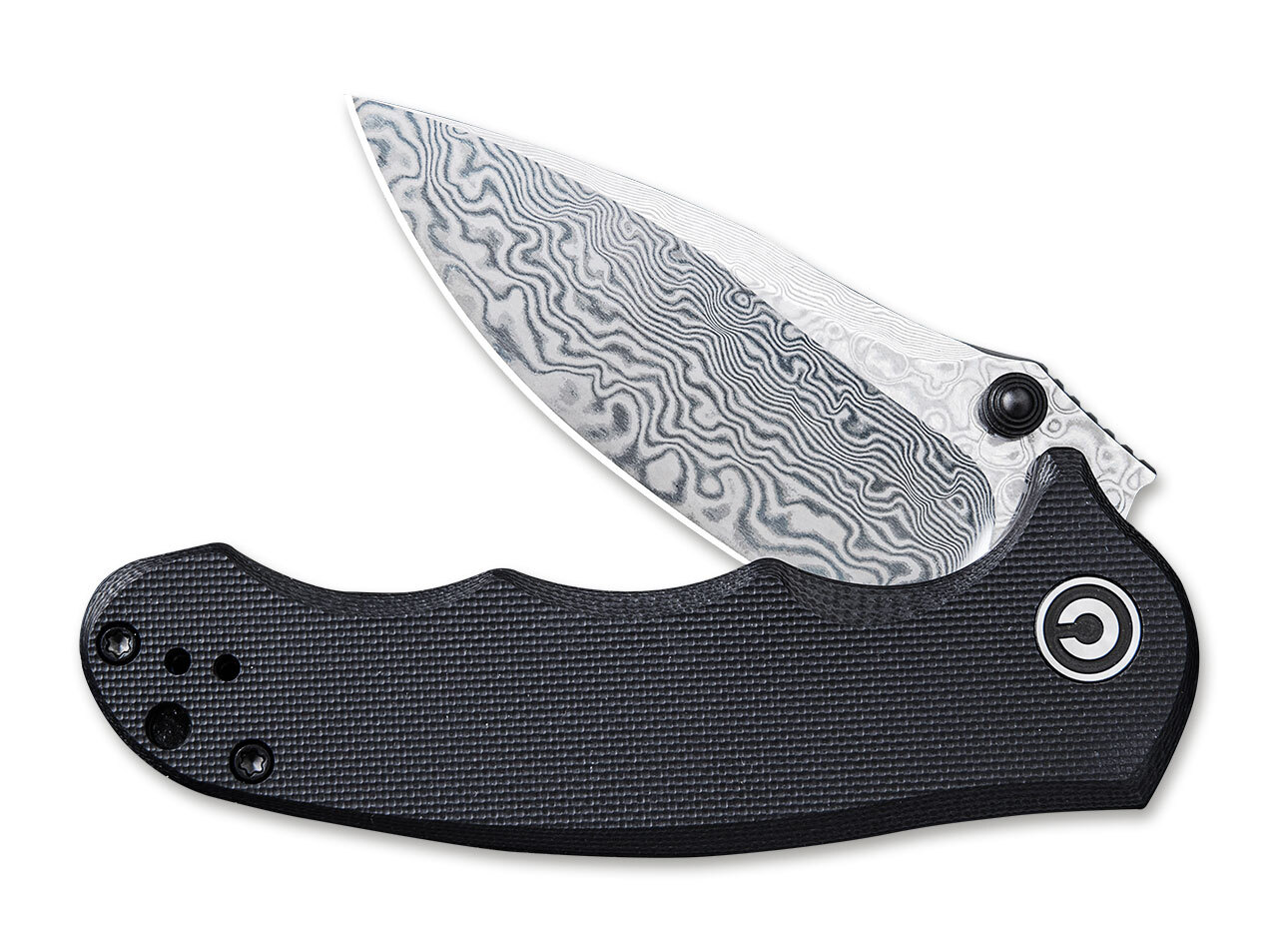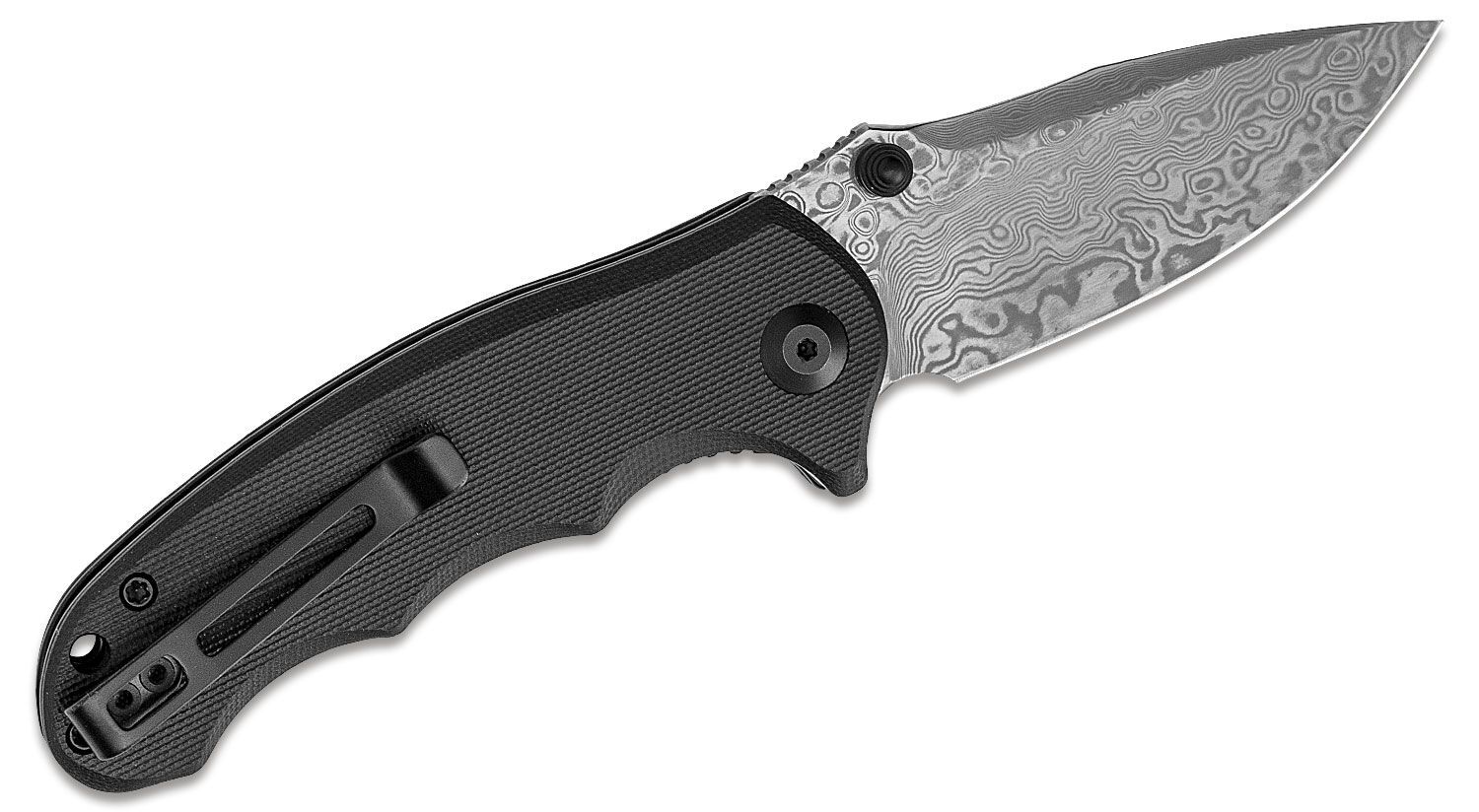La lame est fabriquée en acier damas. Elle "glisse" sur des rondelles en bronze, assurant une ouverture fluide et rapide. Elle s'ouvre d'une seule main, à l'aide d'un ergot sur la lame. Le couteau ouvert est sécurisé par un Liner Lock.