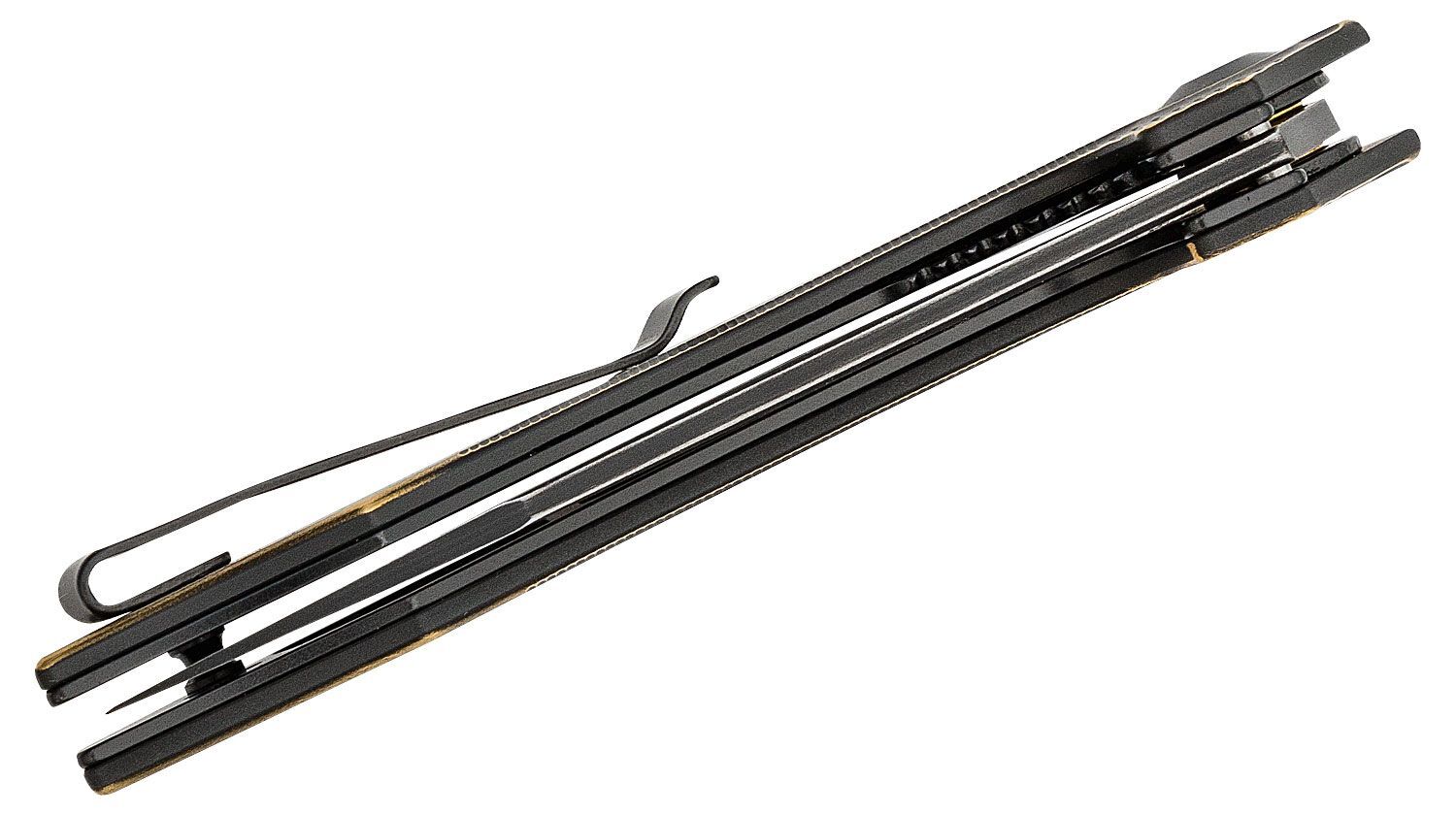 Le manche est usiné en laiton noirci, patiné à la main. Il est renforcé par des inserts en acier noir. Le clip de poche est sombre et à deux positions. Il offre une insertion profonde et discrète. Le couteau est léger et idéal pour un port quotidien.