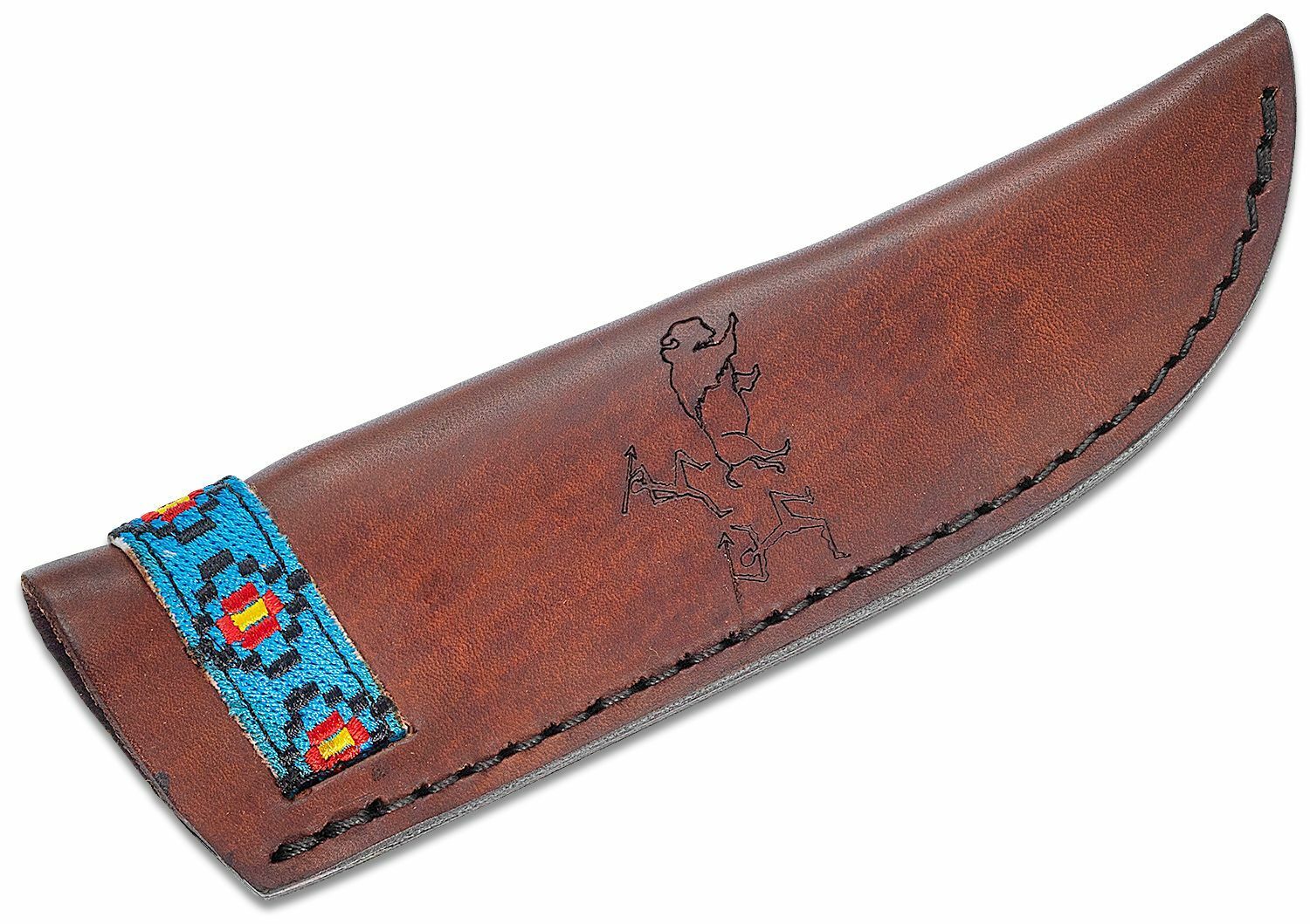 Le couteau est livré avec un étui en cuir. Il est décoré d'un ruban court et d'un motif représentant la chasse aux bisons.