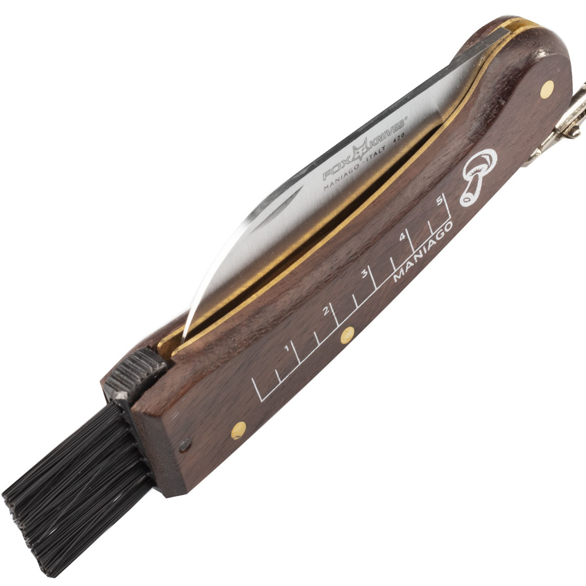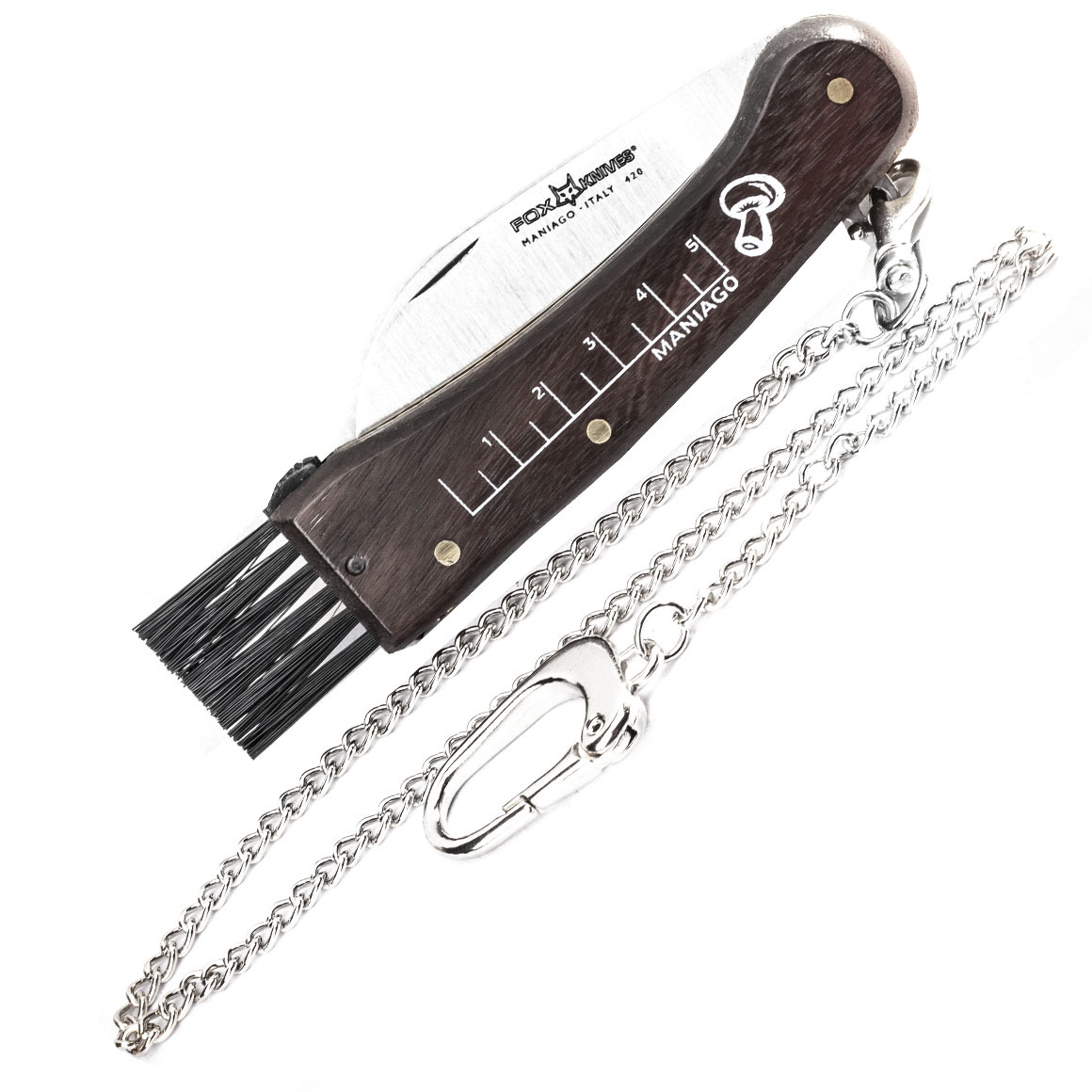 Fox Knives FUNGHI couteau pliant adapté à la collecte et au nettoyage des champignons. Il a une lame incurvée en acier inoxydable 420 et un manche en bois de rose qui a une brosse de nettoyage de la saleté à l'extrémité de la brosse. En haut se trouve une règle pour mesurer la taille des champignons. Il est livré avec une chaîne pour sécuriser le couteau et a un mousqueton à la fin.