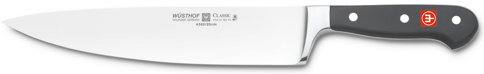 Le couteau de chef Wusthof Classic IKON est forgé à partir d'une seule pièce d'acier (chrome-molybdène-vanadium X50CrMoV15) avec un bord lisse et une longueur de 23 cm. La poignée est rivetée, en matière synthétique POM noire avec un noyau métallique. Il convient pour trancher ou hacher des fruits, des légumes ainsi que de la viande et du poisson.