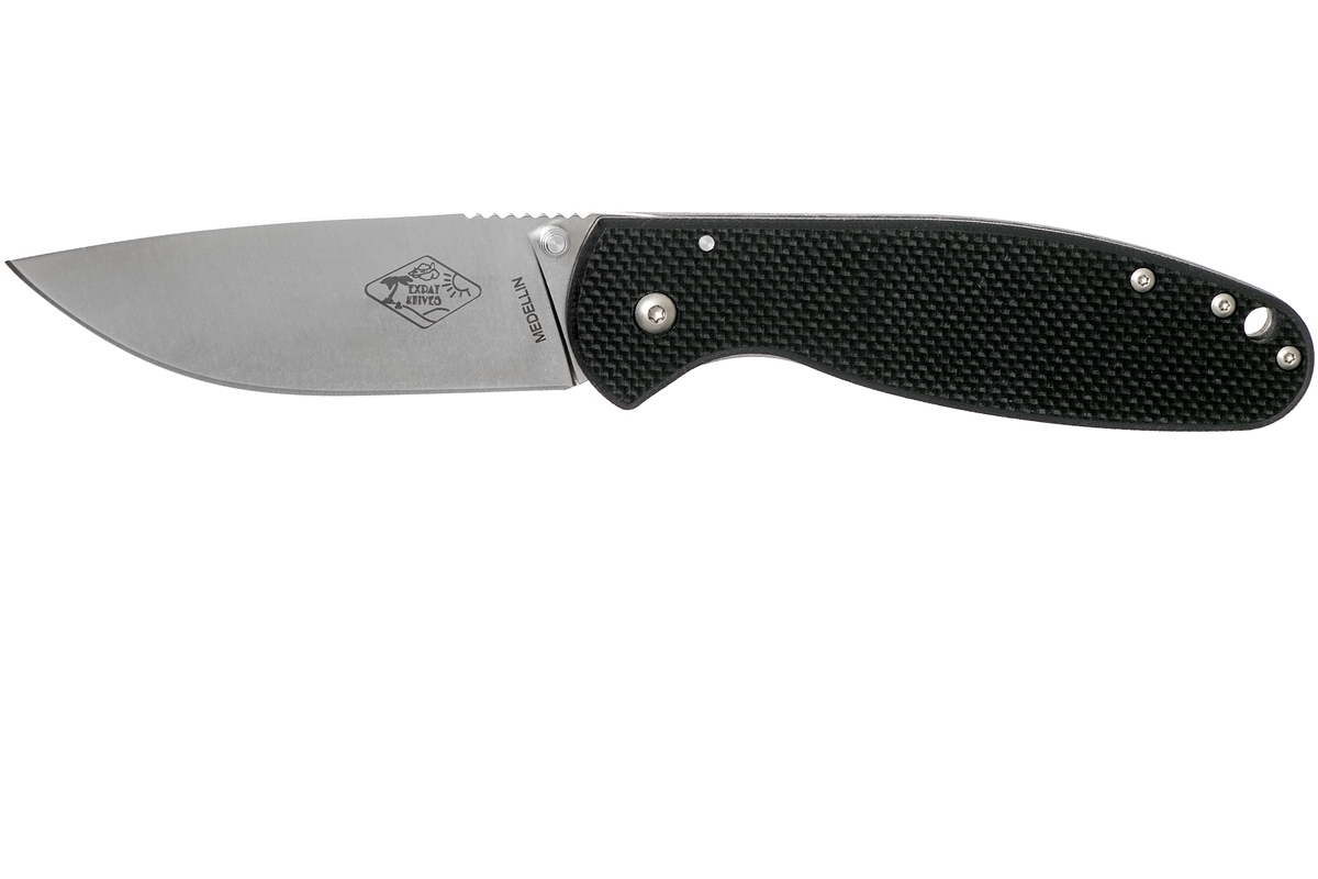 L'EXPAT MEDELLIN a été nommé d'après la ville où le designer a passé un certain temps. Ce couteau est pliant et offre un excellent rapport qualité-prix. Il est compact et fiable. La lame est fabriquée en acier AUS-8 avec une finition satin. Le manche est en G10 noir. Le couteau ouvert est sécurisé par un mécanisme Frame Lock. Il s'ouvre grâce à un ergot sur la lame. Le clip de poche peut être déplacé de l'autre côté selon les besoins.