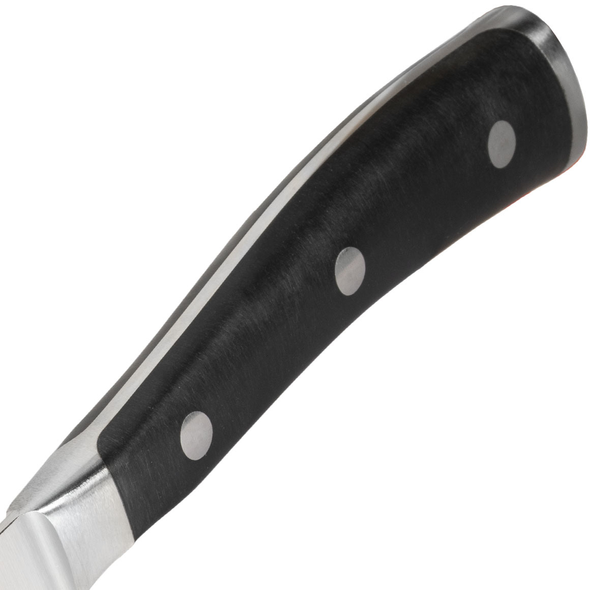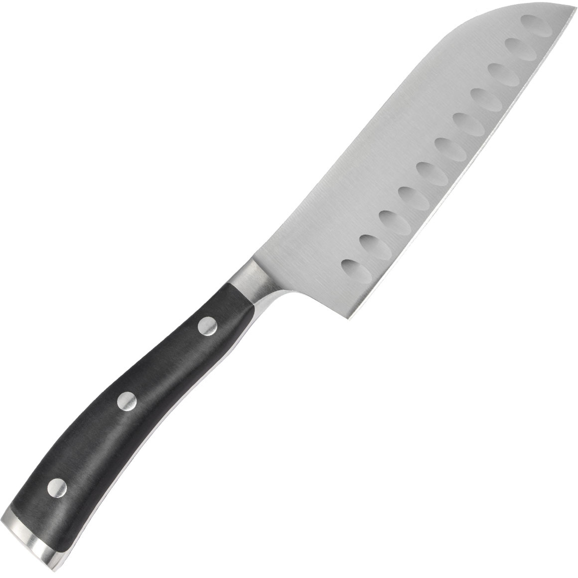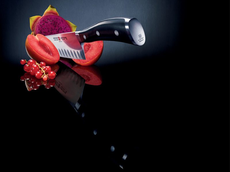 Couteau japonais Wüsthof CLASSIC IKON pour préparer des plats de la cuisine européenne et asiatique sur une planche à découper. La lame de 14 cm de long à bord lisse présente des évidements qui empêchent les tranches de nourriture de coller à la lame. La poignée est en matière synthétique noire POM.