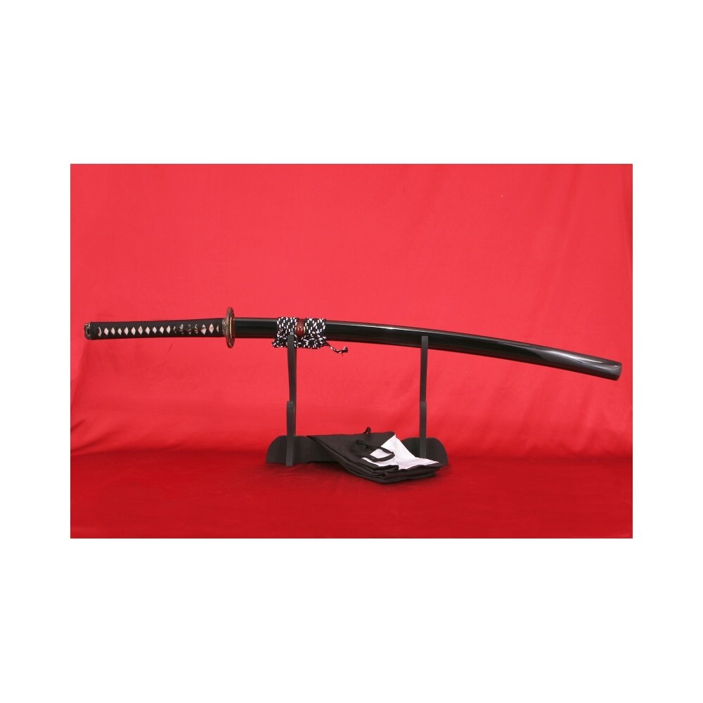 La lame forgée est fabriquée en acier au carbone 1095 de la plus haute qualité avec une dureté impressionnante de 58 HRC. La lame avec gorge bo-hi a été polie à la main dans sa phase finale avec une pierre hazuya - ce qui permet d'obtenir un tranchant presque rasoir et un éclat miroir. Le véritable Choji hamon est formé selon les anciennes méthodes de trempe traditionnelles, basées sur de nombreuses années d'expérience du maître forgeron. Tout sur ce sabre est fabriqué individuellement, y compris le saya et le habaki. Les meilleurs composants ont été utilisés dans la fabrication, y compris un vernis de haute qualité pour le saya.