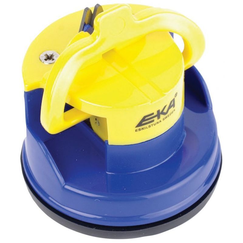 Meuleuse combinée de poche en carbure EKA CombiSharp Blue / Yellow avec un diamètre de 65 mm. Pour différents types de couteaux. Dans la partie inférieure, il a un bouchon, grâce auquel il est fermement installé sur toutes les surfaces planes.