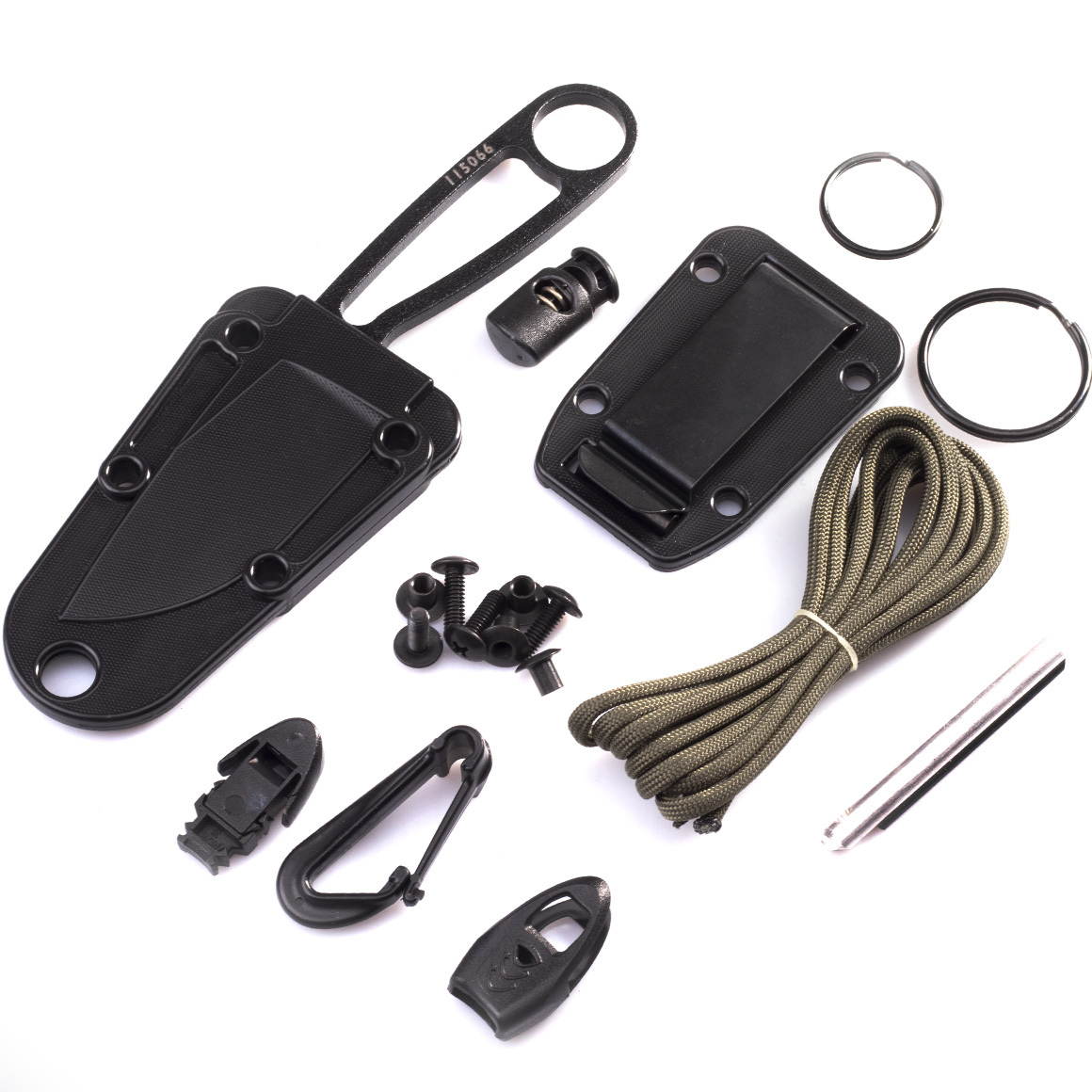 Il contient : Fourreau en plastique + clip à visser pour pantalon et vis avec rondelles, allume-feu, paracord, anneaux, boucle avec sifflet intégré, mousqueton.