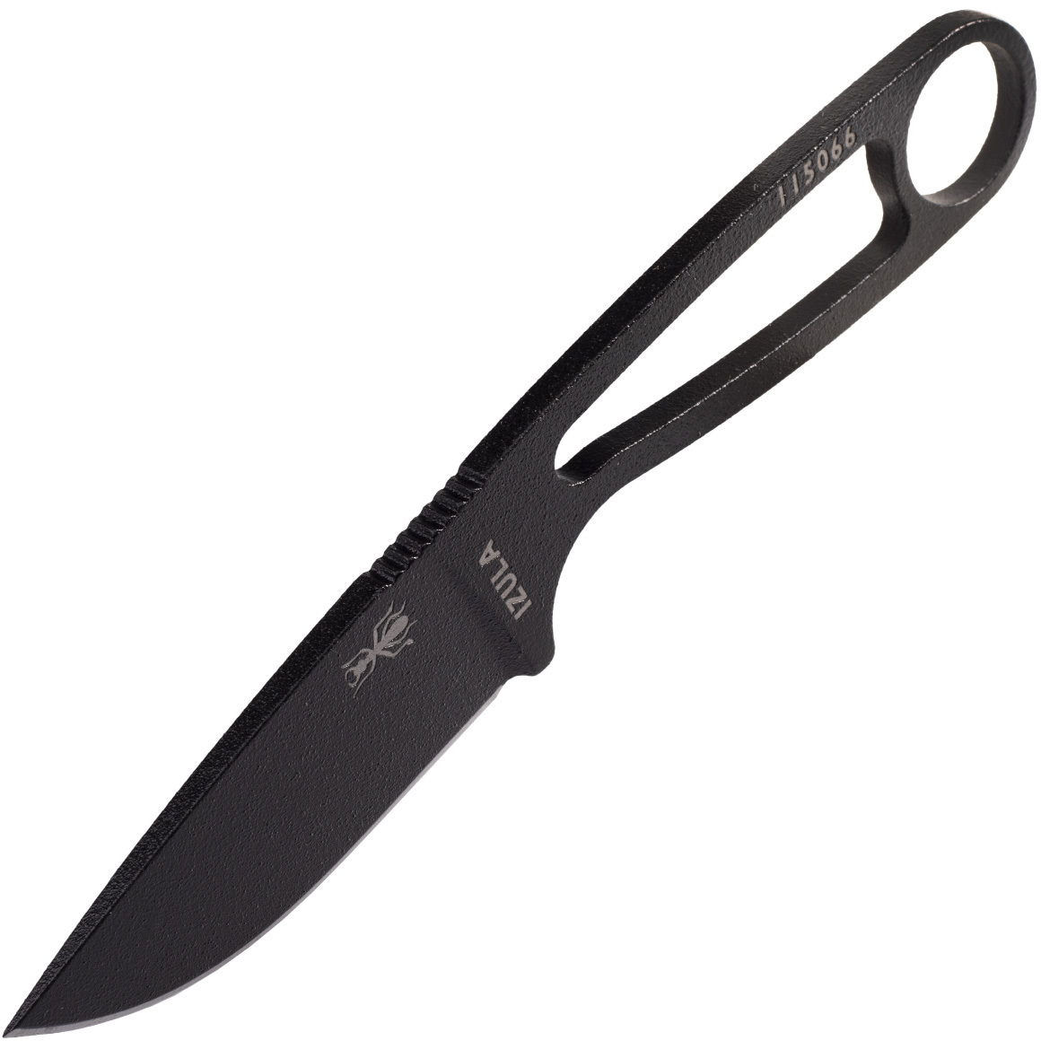 L'Izula est une lame fixe universelle. Le couteau se glisse facilement dans un sac à dos ou une poche, ou vous pouvez le porter autour du cou. Il se tient très bien et fermement. L'auriculaire trouve facilement un appui dans l'œillet à l'extrémité du manche. Vous pouvez utiliser, par exemple, du paracord pour enrouler la poignée. La lame est fabriquée en acier au carbone 1095 avec une dureté de 57 HRC. Elle est dotée d'un revêtement en poudre foncé car elle est sujette à la corrosion. Il est judicieux de garder ce couteau sec et légèrement huilé. Elle est bien sûr un peu plus épaisse pour bien accomplir le travail confié. Le fourreau est en plastique, avec un clip à visser pour le pantalon. Le couteau s'adapte parfaitement au fourreau.