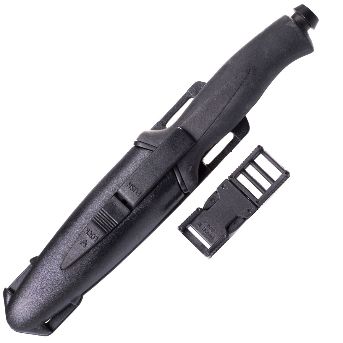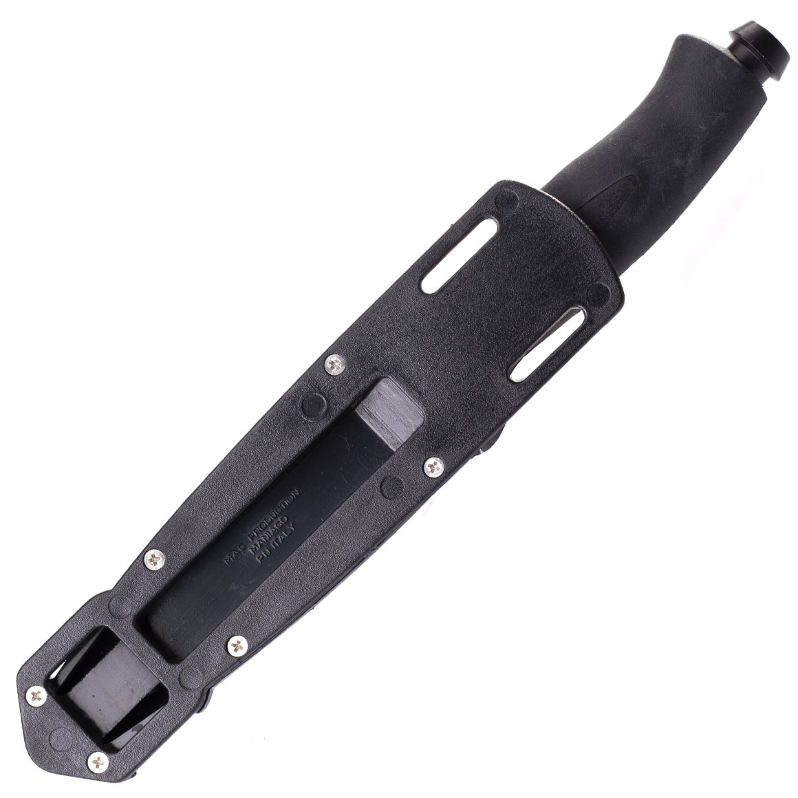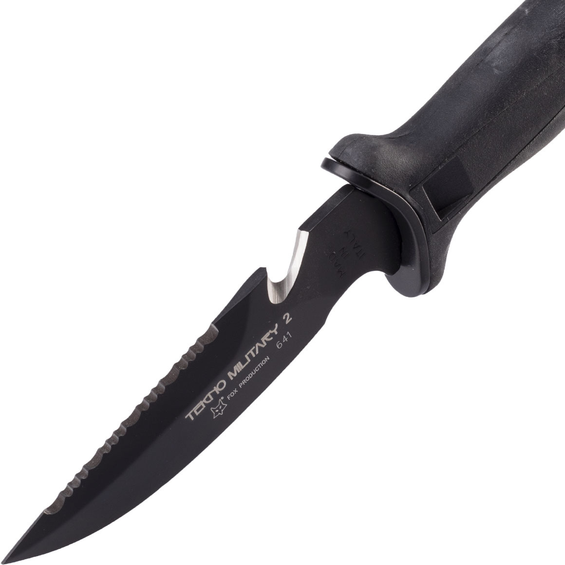 Le couteau tactique Tekno Military II a une lame noire partiellement dentelée à l'arrière en acier inoxydable 420C. La poignée est en deux composants - en polypropylène noir avec inserts en caoutchouc.Elle est massive et tient bien dans la main et humide. Le fond a un brise-verre. La poignée est séparée par un garde pour protéger les mains. Livré avec un étui en nylon compatible avec le système MOLLE.