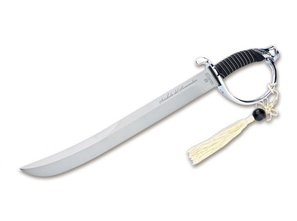 FX-2006 Sommelier Champagne Sabre - Fox Sommelier Saber.Ce magnifique sabre de Fox Knives est nouveau et intentionnellement flou dans une boîte en bois unique avec un présentoir en bois noir. Ce sabre fabriqué avec précision se distingue par ses glands jaunes et est conçu comme une épée festive. La poignée est en caoutchouc synthétique noir recouvert de fil de laiton. La lame est en acier inoxydable T5MOV (5,2 mm).