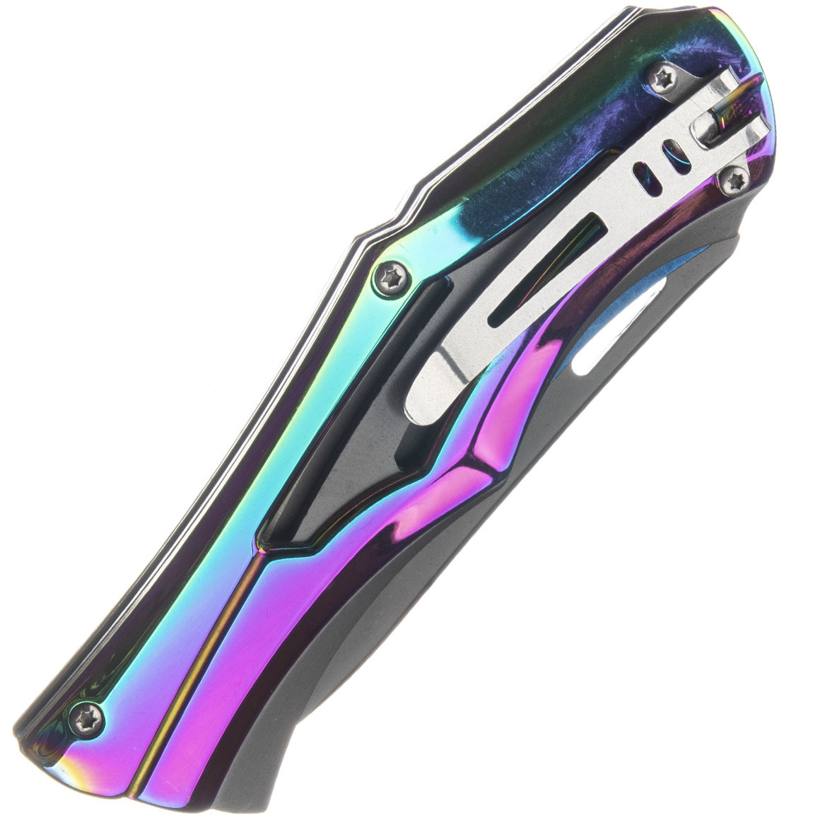La conception spéciale du couteau de poche Herbertz attire immédiatement l'attention. L'acier inoxydable AISI 420 est utilisé pour la lame revêtue de titane, qui est solidement verrouillée. La structure à trois couches de la poignée en acier inoxydable est composée de plaques bleues, d'un couvercle central avec un revêtement en titane et d'un couvercle de poignée avec un revêtement arc-en-ciel. L'appareil est équipé d'un clip de poche.