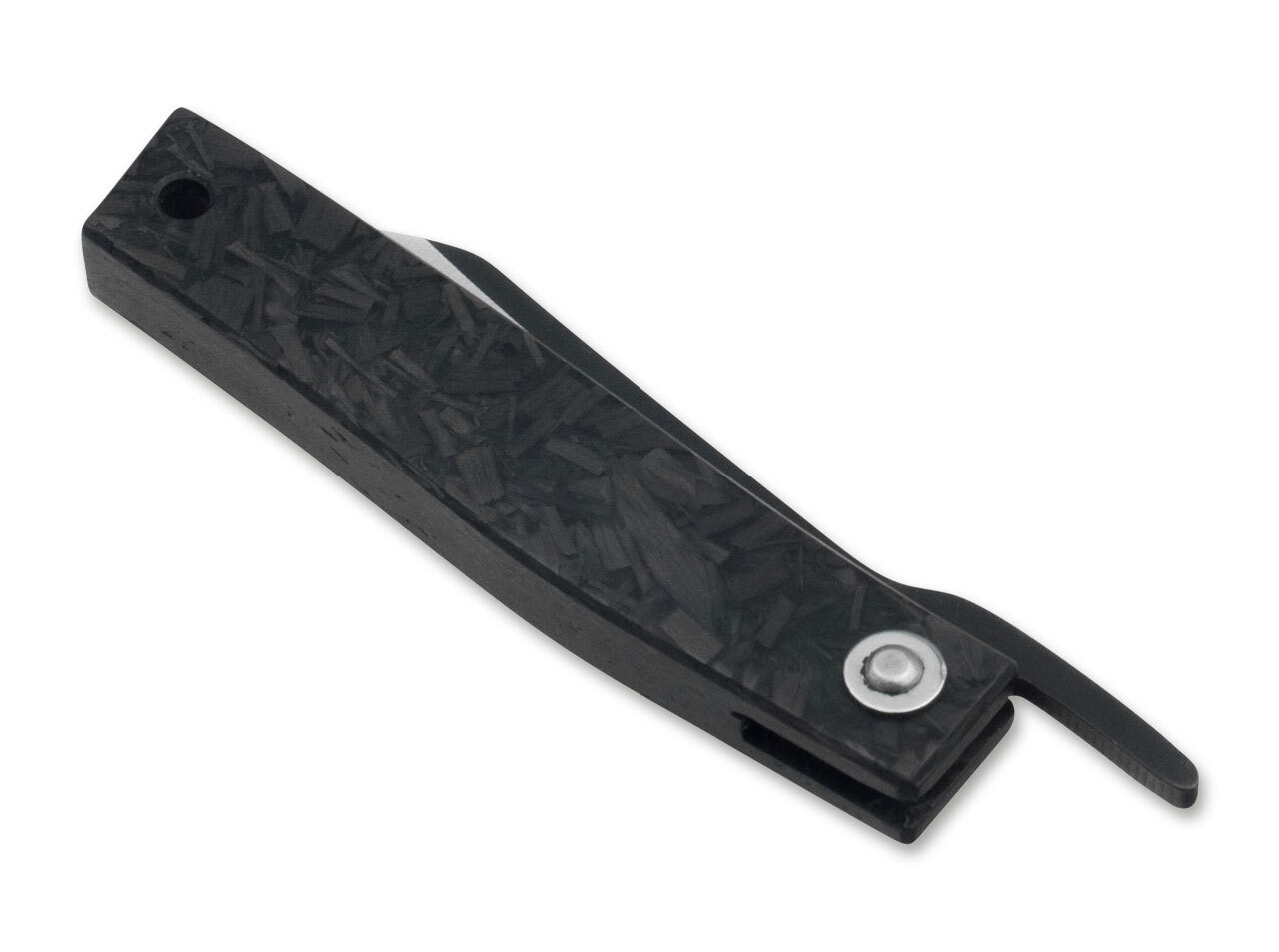 La lame étroite en acier inoxydable 7Cr17MoV s'ouvre grâce à un mécanisme à levier Friction. Le couteau n'est pas équipé d'un mécanisme de verrouillage, la lame est maintenue en position ouverte uniquement par la pression sur le levier. Le manche est fabriqué en fibres de carbone. À l'extrémité du manche se trouve un trou pour une lanière.