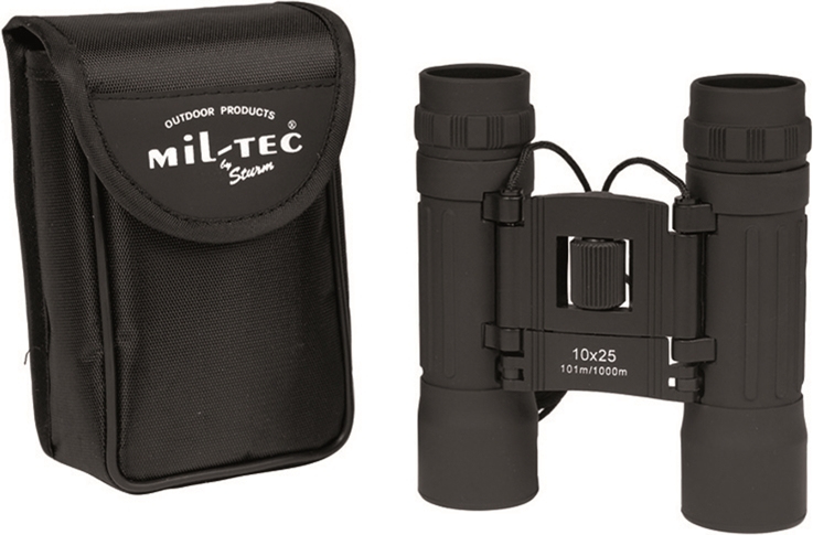 Jumelles pliantes 10 x 25. Les lentilles sont recouvertes d'un matériau élastique qui protège les jumelles d'éventuels dommages dus à une légère chute. La mise au point dans la plage 4-8 Dptr, y compris l'objectif droit, a un réglage supplémentaire (± 4 Dptr). Les jumelles sont livrées avec un chiffon pour nettoyer les étuis et les lentilles. Il est possible de fixer la housse à la ceinture ou à l'équipement ou au cou au moyen de lacets. Étui inclus (100% nylon).