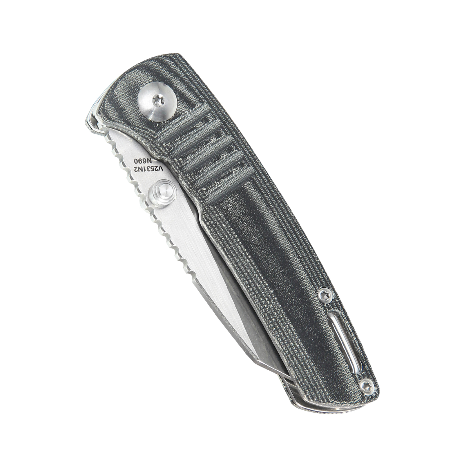 La lame en acier de haute qualité N690 s'ouvre avec le pouce grâce à un ergot sur la lame et est maintenue en position ouverte par un mécanisme Liner Lock. Le manche est fabriqué en micarta résistant. À l'extrémité du manche se trouve un trou pour une lanière. Le couteau est équipé d'un clip pour le port en poche.