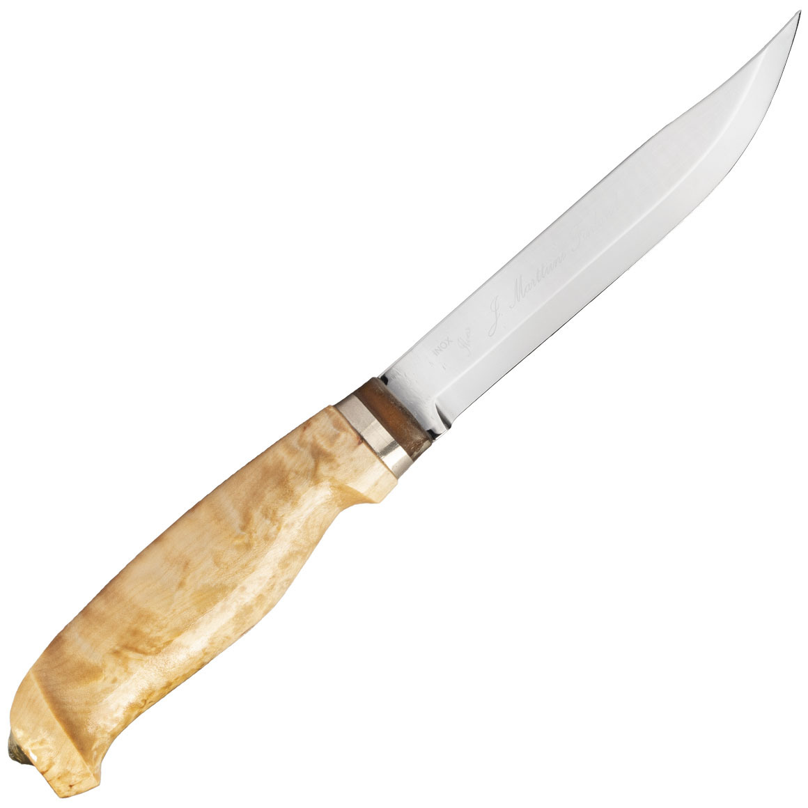 Couteau de chasse Marttiini Lynx 139 avec une lame fixe avec un bord lisse en acier inoxydable chromé d'une longueur de 12 cm. Poignée en bouleau frisé finlandais, avec bouclier en laiton. Livré avec un étui en cuir à décor lapon.