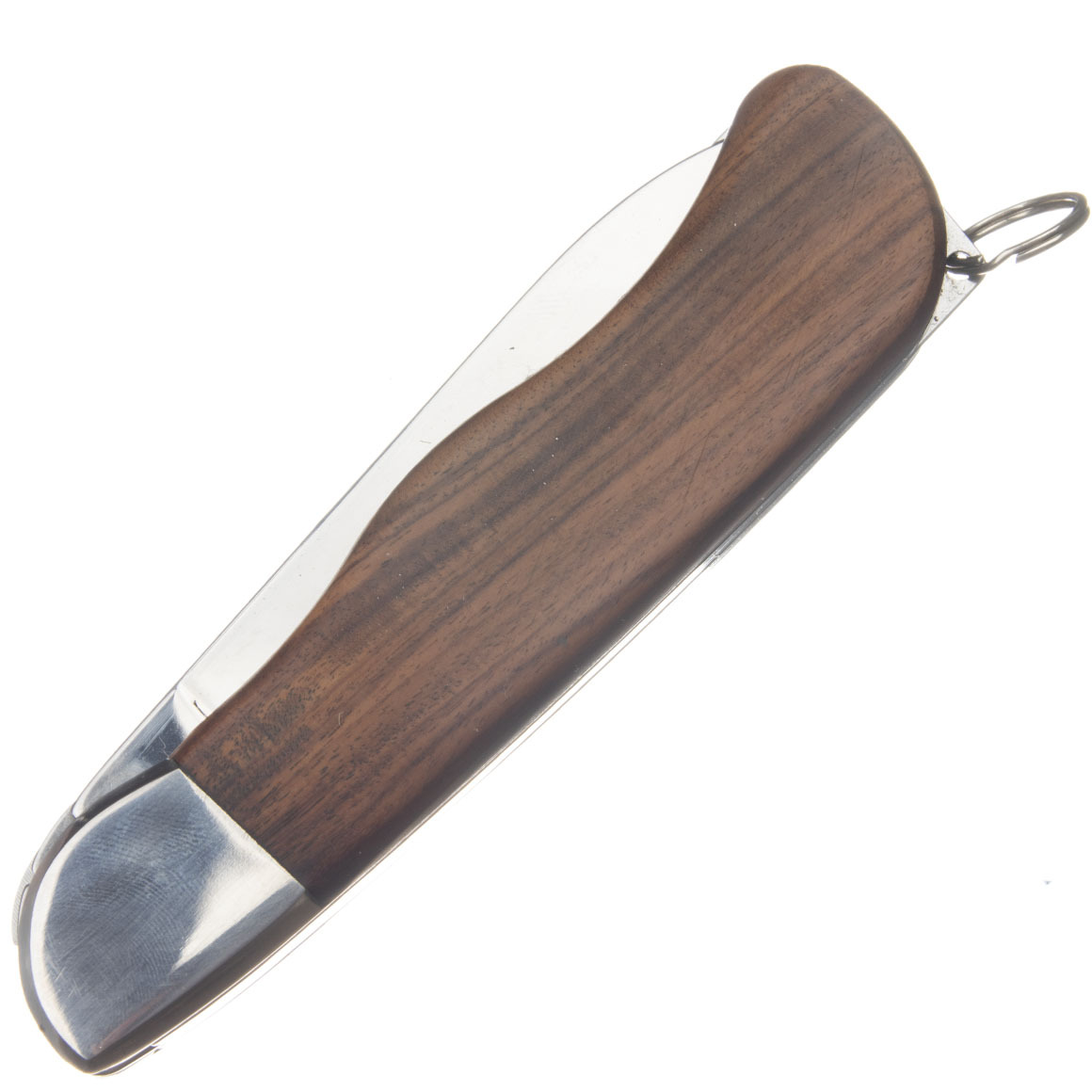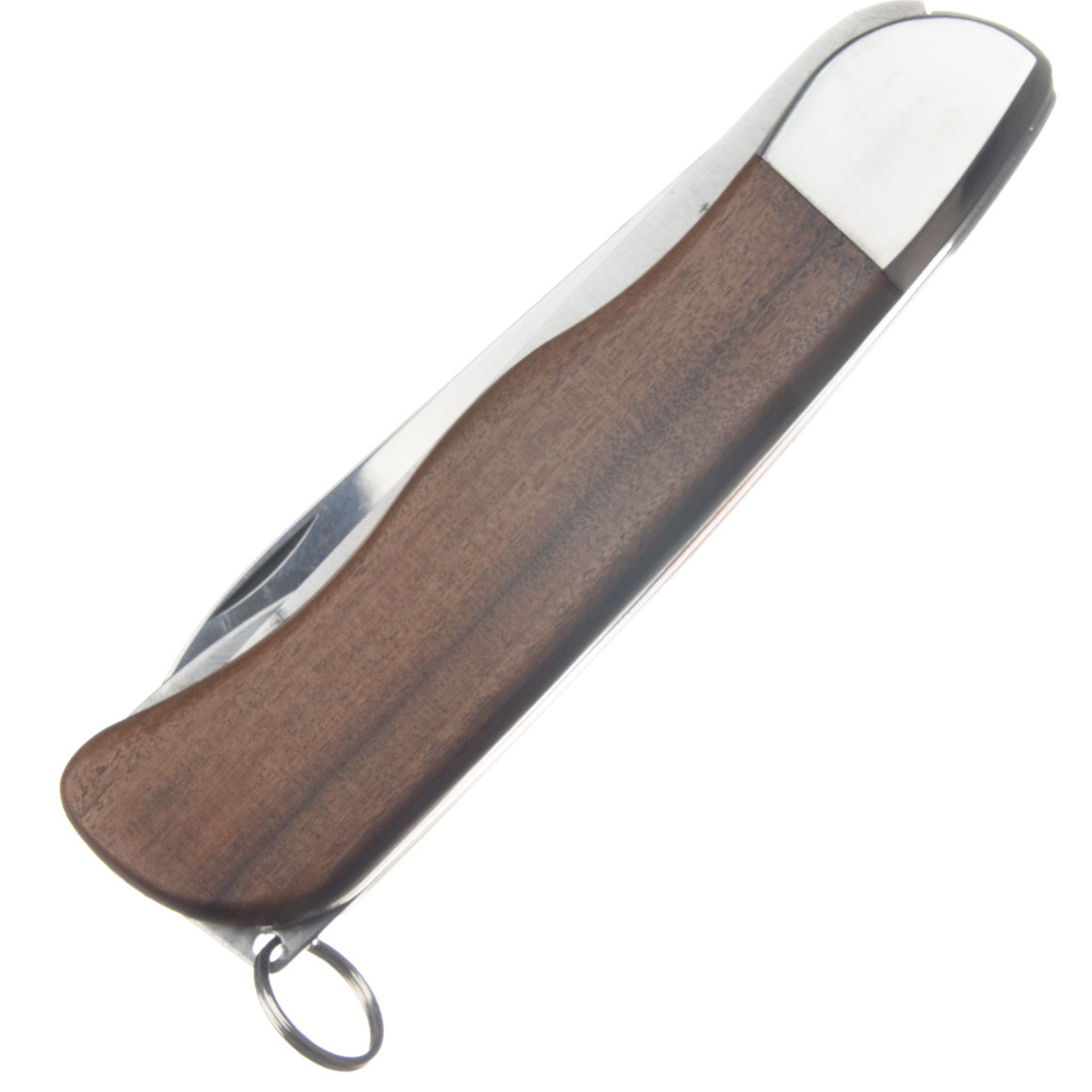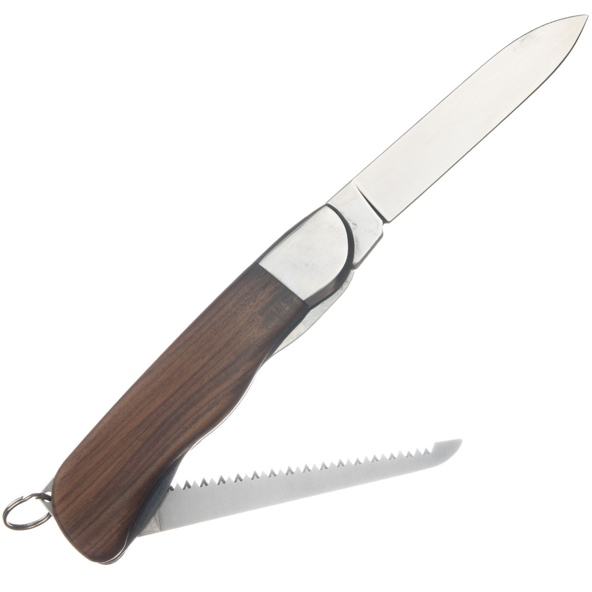 Couteau de poche pliant d'extérieur Mikov 116-ND2 AK / KP HIKER a une lame en acier inoxydable 420 avec Linerlock, comprend une scie à deux rangées de dents. La poignée est en palissandre de bois exotique. Il a un anneau de montage et est livré dans un étui en cuir avec le logo Mikov.