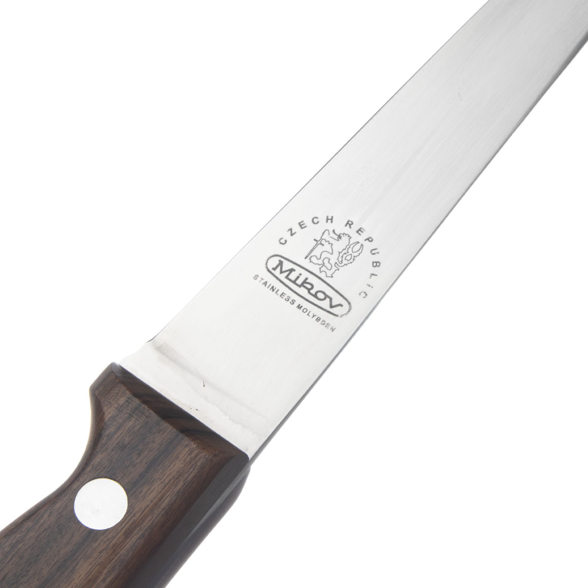 Couteau de cuisine universel Mikov 319-ND-15, qui peut être désossé et couper la viande, les tendons coupés et les parties grasses de la viande. Il a une lame conique en acier 425 de haute qualité avec une coupe conique (cunéiforme). La poignée est en bois de rose brésilien durable avec des fils d'aluminium. Certifié pour le contact avec les denrées alimentaires selon les normes de l'UE. Avec boîtier en PVC.