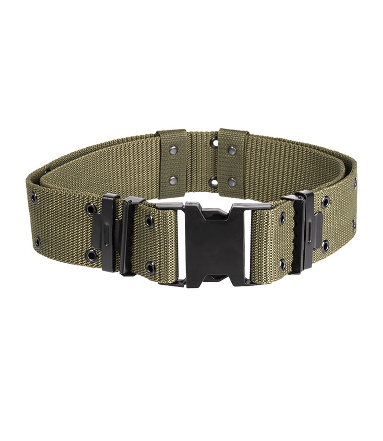 Ceinture tactique Mil-Tec US LC2 de couleur olive en polypropylène, qui peut supporter des charges encore plus lourdes. Il est allumé et libéré avec une boucle à dégagement rapide en polyoxyméthylène (résistant à l'usure ou à la tension).