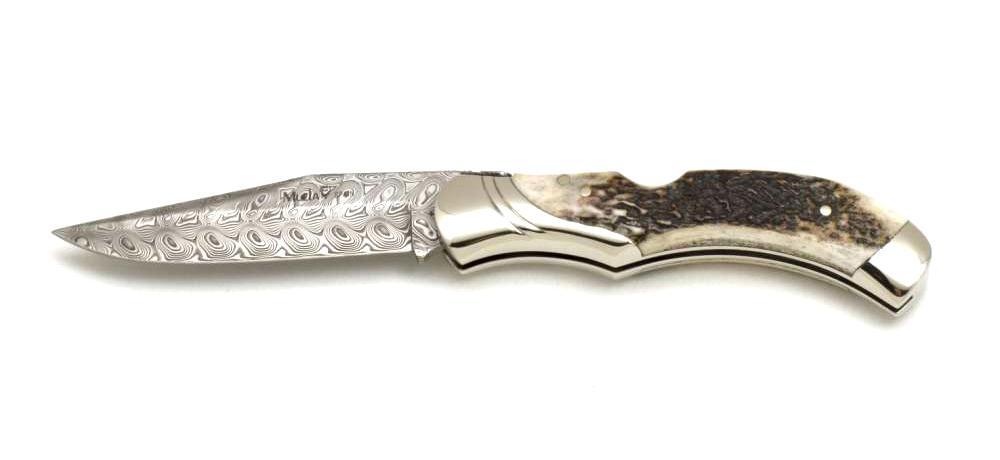 Un beau couteau pliant de la société espagnole Muela avec une lame en acier damassé avec un motif circulaire profond. Les meilleurs aciers RWL34 et PMC27 ont été utilisés pour la production. Le résultat est une lame avec des propriétés mécaniques supérieures à la norme telles que la résistance à la rupture et à l'usure, la torsion, la résistance aux chocs et à la flexion et d'excellentes propriétés de coupe.