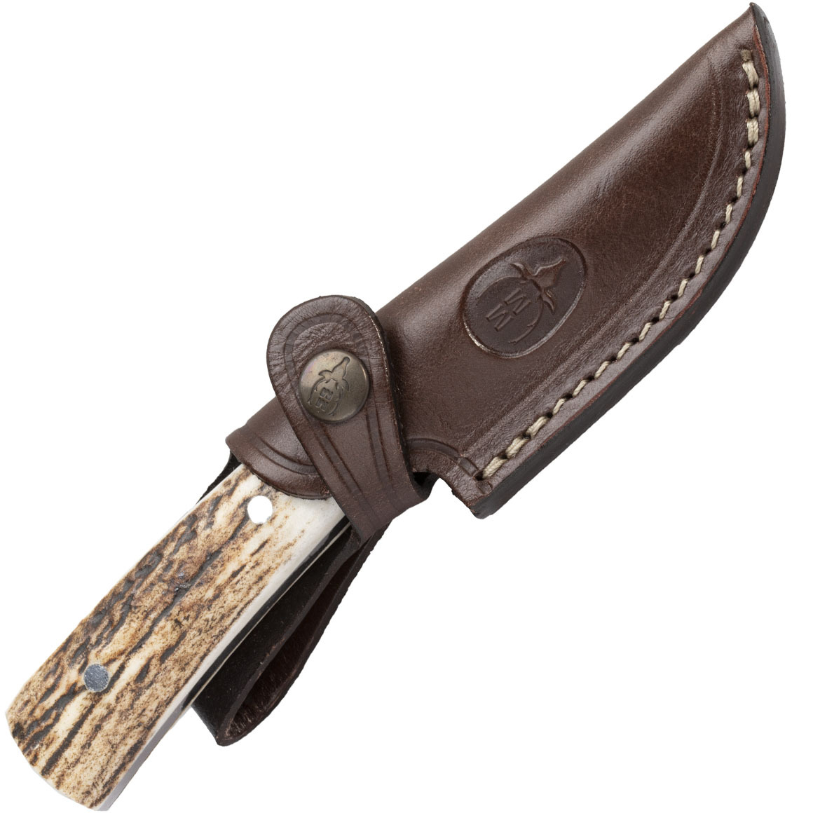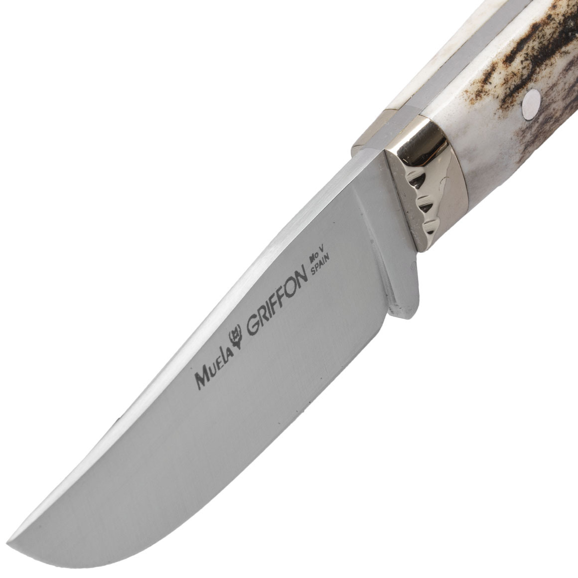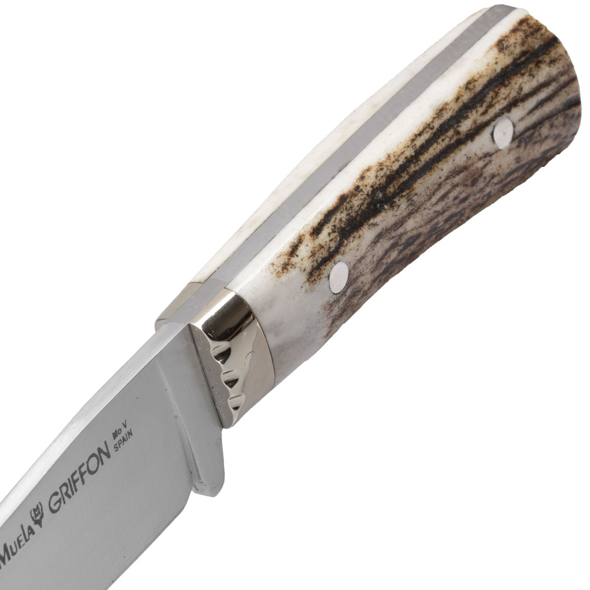 Un petit couteau de chasse intégré de la société Muela. Grâce à sa construction et sa finition de qualité, il est très résistant. Il est composé d'une seule pièce d'acier au molybdène et de vanadium d'une dureté allant jusqu'à 61 HRC. La saillie sur le dessous de la lame forme un protège-doigts