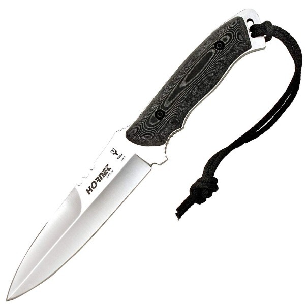 Couteau de combat tactique de la société espagnole Muela. Le couteau a une construction intégrale, ce qui signifie qu'il est fait d'une seule pièce d'acier et est donc extrêmement durable et fiable. La lame a la forme d'un poignard et est rectifiée des deux côtés, tandis que la partie arrière est rectifiée à environ la moitié de la longueur. Il y a un bouclier sur le dessous de la poignée et une saillie crantée sur le côté supérieur pour fermer le pouce.