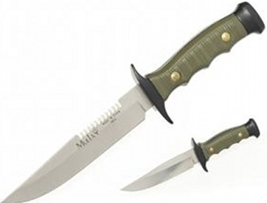 Petit couteau nature solide Muela 7122 P dans un ensemble avec une miniature. Y compris étui en nylon masqué. La lame est en acier inoxydable Inox 1-42 avec une dureté de 54 - 58 HRC et sur le côté supérieur il y a une lame dentelée courte. La poignée est constituée d'une construction en métal noir avec une protection double face, sur laquelle sont fixées des poignées en plastique vert rainuré. Ce couteau comprend également une version miniature du même design sans dentelures avec une longueur totale de 10 cm. Le couteau est livré avec un étui en textile dur dans une conception de camouflage, dans lequel les deux couteaux peuvent être portés simultanément.