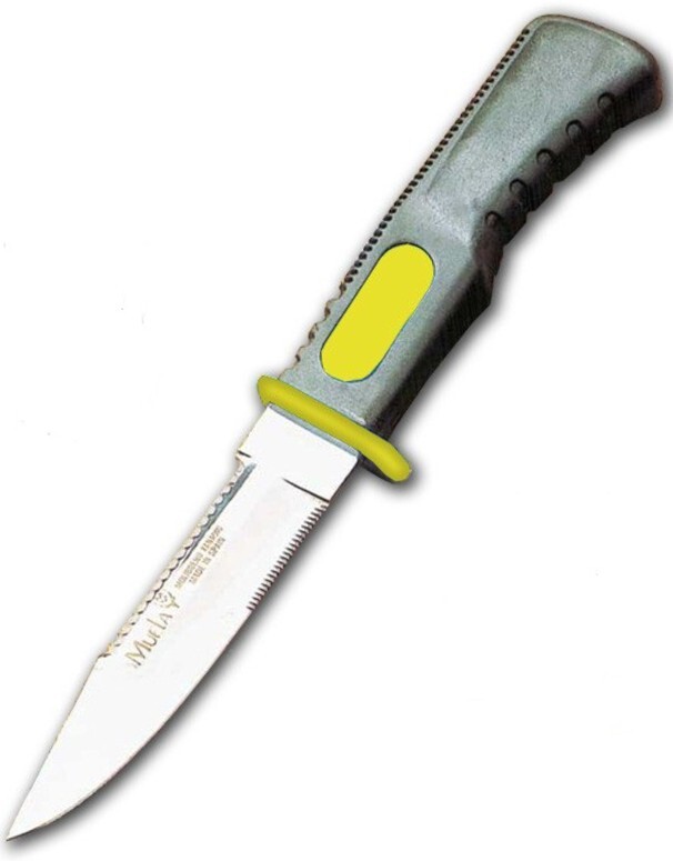 Couteau de plongée Muela SUB-12.5 avec une lame fixe en acier 440 et un manche en caoutchouc avec un bouclier jaune.