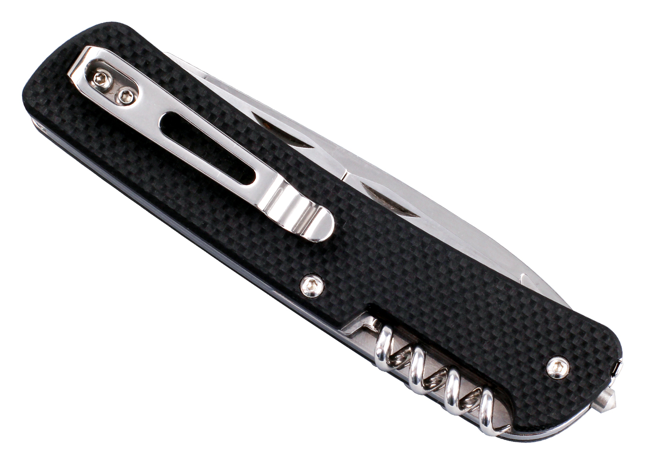 Le manche texturé noir est fabriqué en matériau G 10. En plus de la lame, le couteau comprend : un tire-bouchon, un ouvre-boîte, un tournevis, un grattoir, un décapsuleur, une coupe-fil, un dénudeur de fil, un petit tournevis, un crochet de coupe, un tournevis cruciforme, une plieuse de fil, une pince à épiler, des ciseaux, une pince, un poinçon et une scie.