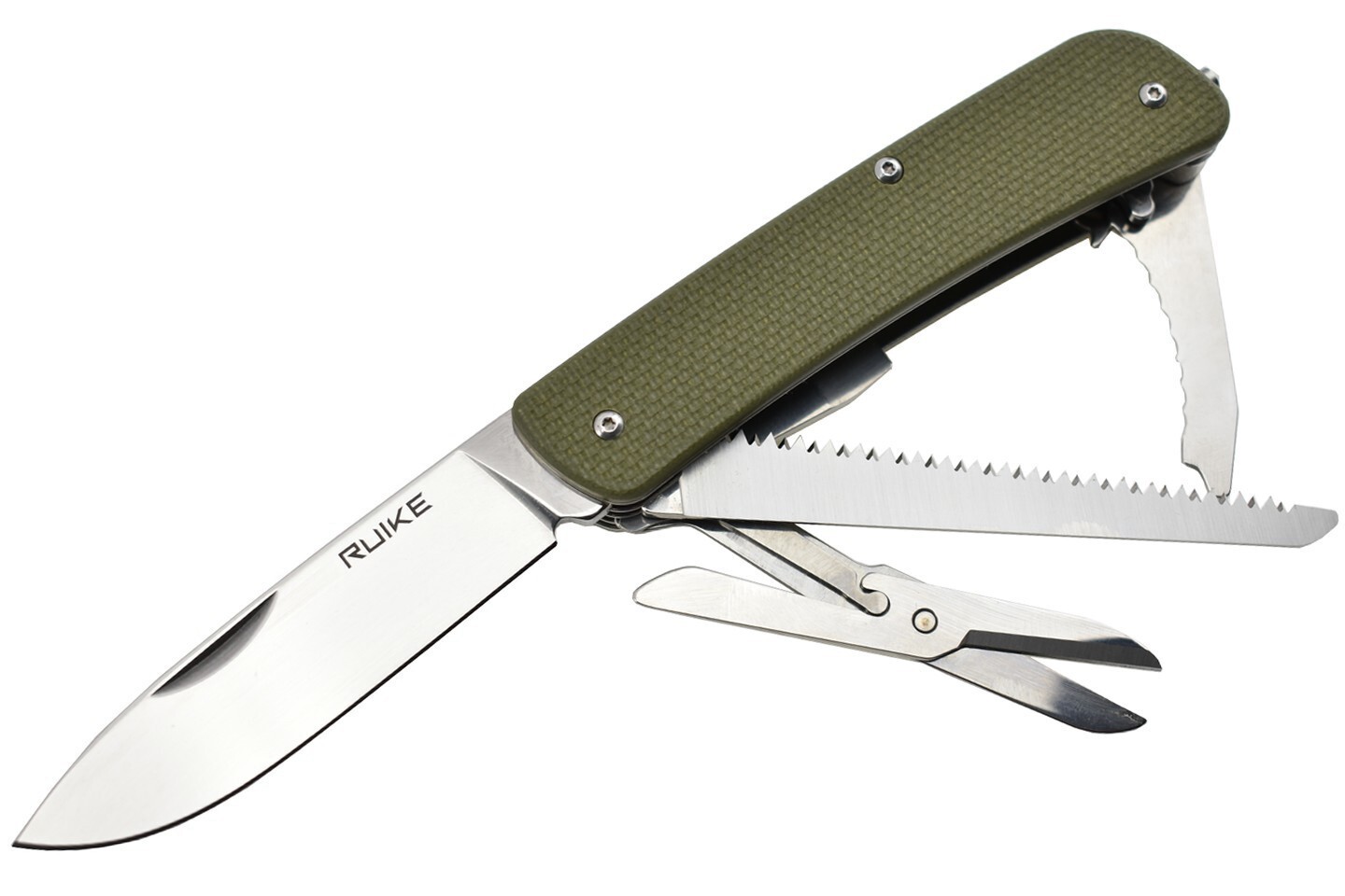 Grâce à sa grande lame et à ses outils robustes, la série Ruike L est adaptée à toutes sortes d'activités en plein air et à une utilisation d'urgence. La lame polie de 8,5 cm en acier inoxydable Sandvik 12C27 a une épaisseur et une largeur accrues pour une durabilité prolongée et une utilisation polyvalente. Le manche texturé en G10 tient confortablement en main et offre une prise sûre, idéal pour une utilisation prolongée. Elle est également équipée d'un tire-bouchon, d'un ouvre-boîte, d'un tournevis, d'un grattoir, d'un décapsuleur, d'un dénudeur de fil, d'un petit tournevis, d'une plieuse de fil, d'un crochet de coupe, d'une pince à épiler, de ciseaux, d'une scie et d'un poinçon. Le brise-verre en acier au tungstène permet à l'utilisateur de briser du verre ou d'autres matériaux résistants. Le couteau s'ouvre grâce à une encoche pour ongle et est sécurisé par un mécanisme à friction. Avec une lanière, un anneau pour clés et un clip pour un port en poche.