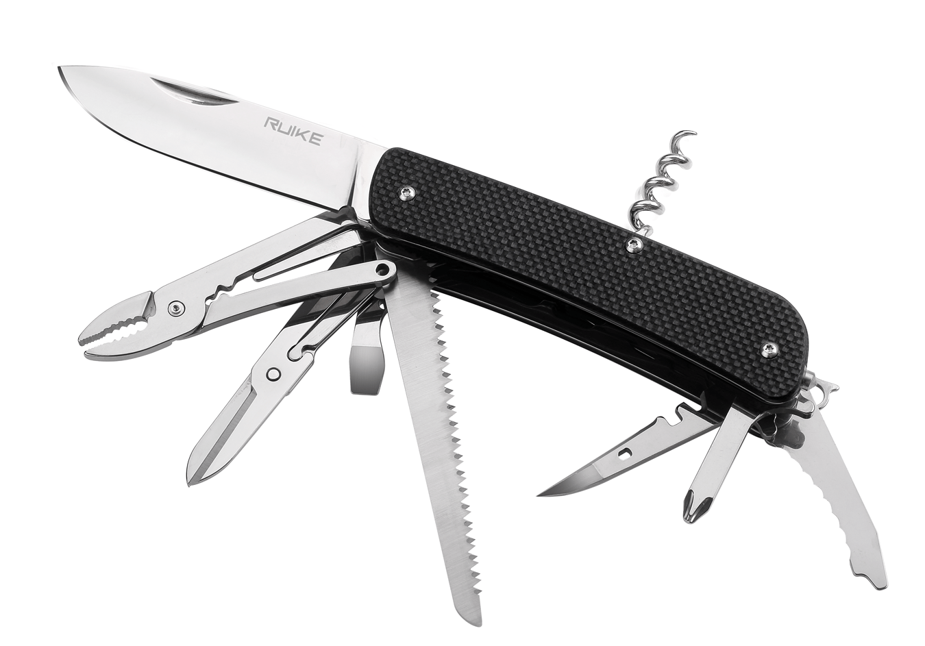 un tire-bouchon, un ouvre-boîte, un tournevis, un grattoir, un décapsuleur, un dénudeur de fils, une coupe-fil, un petit tournevis, un tournevis cruciforme, une plieuse de fils, un crochet de coupe, une pince à épiler, une scie, des ciseaux, une pince et un poinçon. Le brise-verre en acier au tungstène permet à l'utilisateur de briser du verre ou d'autres matériaux durs.