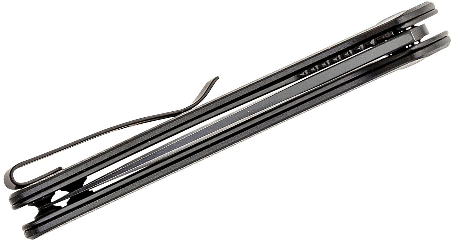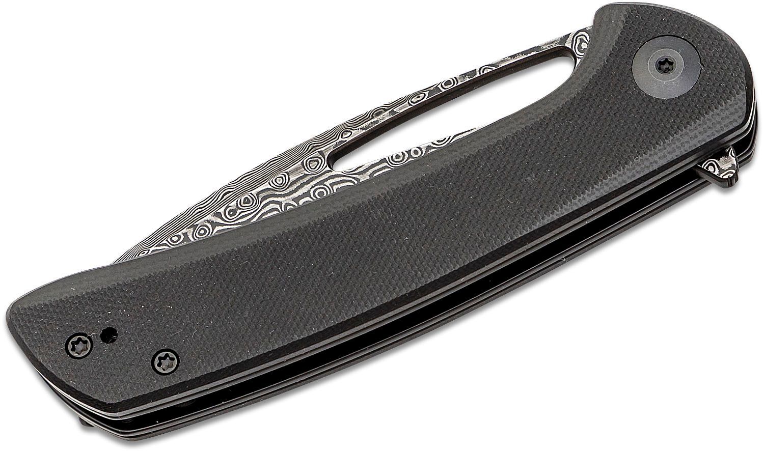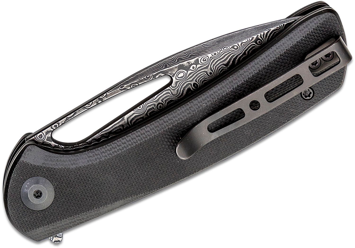La lame en acier damas s'ouvre grâce à un flipper et est maintenue en position ouverte par un Liner Lock. Le manche est fabriqué en G10 résistant. Le couteau est équipé d'un clip pour le port en poche.
