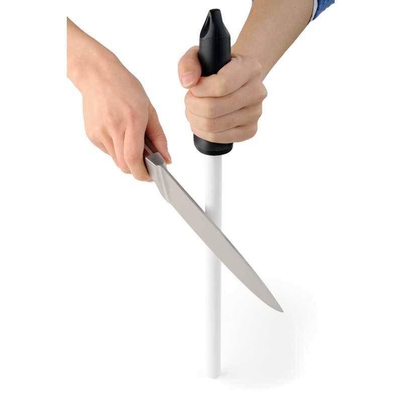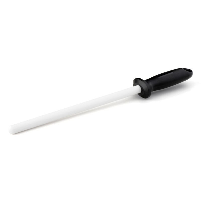 Acier céramique d'une longueur totale de 37 cm. La poignée en caoutchouc est de forme ergonomique. À la fin de la poignée, il y a une ouverture, qui est utilisée pour accrocher, pour un rangement confortable. La taille des grains de la pièce en céramique est # 1200 et la longueur est de 26 cm. Excellent rapport prix / performances.