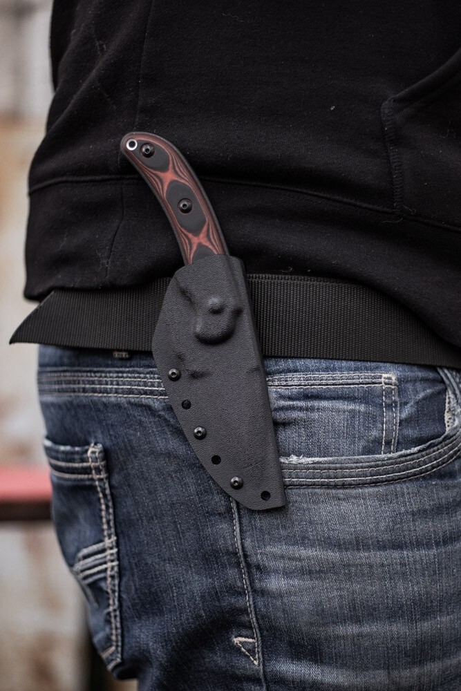 La lame à construction fulltang est fabriquée en acier 1095 à haute teneur en carbone. Elle est protégée contre la corrosion par un revêtement noir. Le manche en micarta résistant est confortable à tenir grâce à sa forme. À l'extrémité du manche se trouve un trou pour passer une lanière.