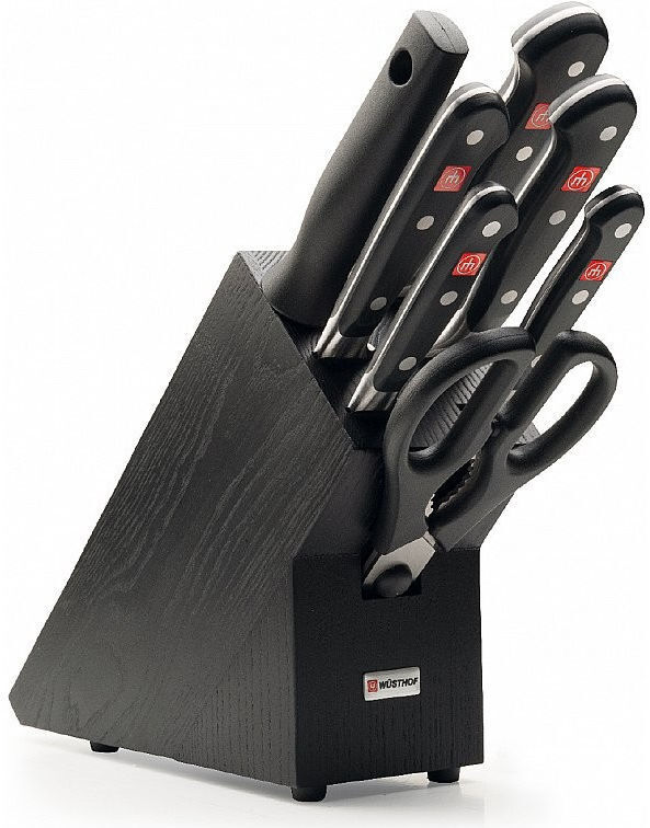 L'ensemble de 8 pièces Wusthof Classic contient 5 couteaux, des ciseaux de cuisine, de l'acier et un bloc de couteaux noir.